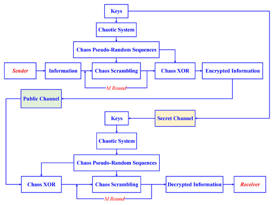 By taking a gray image as an example, the simulation experiments of the encryption algorithm were verified with Matlab software. The flowchart of chaos-based secure communication is shown in Figure 10. On the sender side, the pseudorandom sequence is generated with the keys in the first, and original information is encrypted by the scrambling encryption in Encryption 1 for M rounds; then, it encrypted by the second chaos XOR encryption in Encryption 2. Therefore, the encrypted information is transmitted to the receiver via the public channel, and it is recovered by the inverse operations of encryption algorithm with the correct keys.