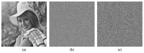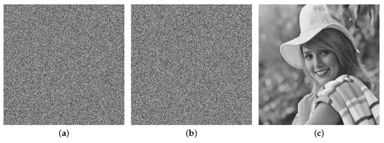 In the receiver end, one can recover image I with the same initial conditions and parameters, and the recovered image is given in Figure 12c. However, it cannot be successfully recovered if one of the initial conditions or parameters is incorrect, and the corresponding experiment results are shown in Figure 12a,b.