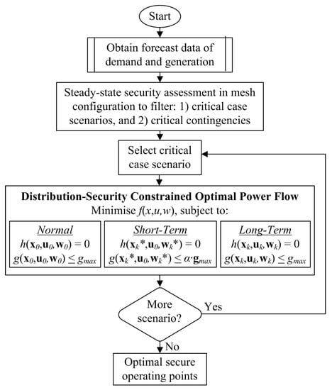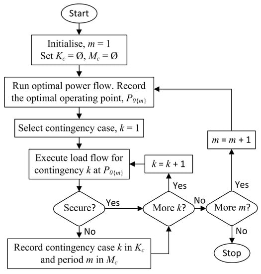 An iterative procedure is proposed to identify the set of critical contingencies and case scenarios for each time period. The simulation is carried out in a meshed configuration (i.e., all tie switches are closed, in order to account for the worst conditions). Figure 2 shows the iterative procedure being used in this assessment to select the potential critical contingency cases. Let K be the set of contingencies used in the security analysis (i.e., line outages at the main feeders, including the transformers of the main distribution substation) and let be the set of critical case scenarios. Let be the optimal operating point at period . The proposed iterative procedure in Figure 2 can be further explained as follows: