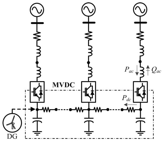 - MVDC: Modified hybrid configuration, where the MVDC interface acts as a platform for all DGs with internal DC links and loads, as shown in Figure 5. The MVDC configuration is an extension of use of DC links in [,], using the same number of VSC stations.
