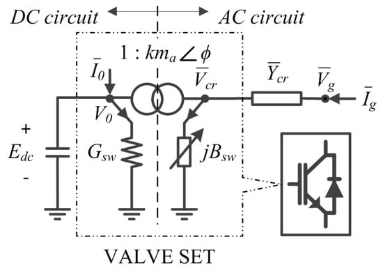 The nodal power injections at either side of the VSC, i.e., the bus g (AC side) and bus 0 (DC side) are calculated by expanding Equation (3) and knowing that the VSC is interfaced to the AC side by an equivalent phase reactor with admittance, :