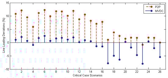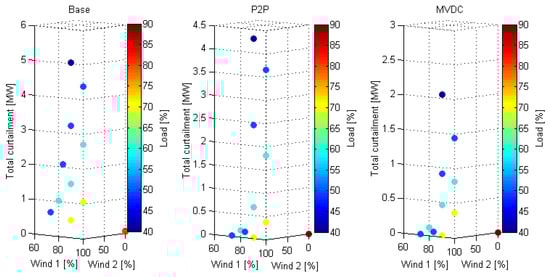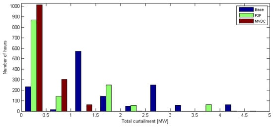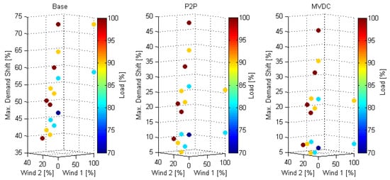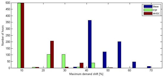 Figure 7 and Figure 8 show the percentage of maximum demand shift for the analysed three system configurations. The largest demand shift occurred during a period of high demand and low generation (load at 100% of peak demand and both wind generations are 0%), as shown in Figure 7. However, this scenario did not appear very often as shown in Figure 8. Results showed that a demand shift of 73.9% in the base case could be reduced to 49.3% (with the P2P configuration) and to 46.7% (with the MVDC configuration). Hence, the MVDC configuration presented the best performance. This particularly can also be observed in Figure 8, where maximum demand shift using P2P configuration was between 30%–45%, while it was reduced significantly to 25%–40%, when using the proposed MVDC configuration.
