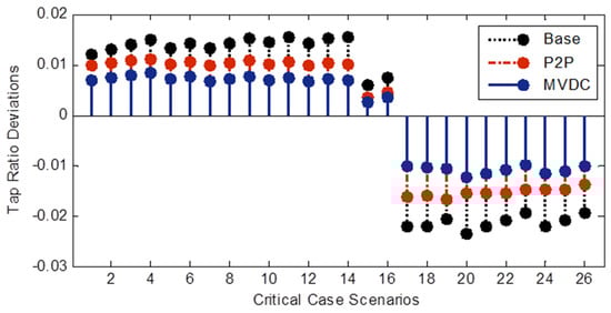 The base case does not contain VSCs and, therefore, the only control actions available to the DSO are the LTC voltage control, DG curtailment, and flexible demand shifting. In both, P2P and MVDC configurations, all available active network management schemes in the base case are used, in addition to the control actions of the VSCs. The D-SCOPF algorithm described in Section 2 has been implemented in AIMMS []. The optimisation problem is solved using CONOPT 3.14V on a PC of 3.5 GHz and 8 GB RAM. The performances of the three configurations are compared in terms of operating costs, demand shift, DG curtailment, line power loadings, and tap ratio optimal settings.