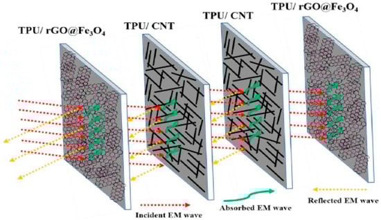It is known that electric and magnetic signals help to regulate the behavior of living cells and processes such as control of the cell cycle, tissue regeneration, proliferation of cells, cell wound repair, etc. []. The global research in the biomedical field is being conducted on testing the effects of the electric and magnetic fields on the living cells which may aid in the healing process if induced with relatively low intensity. However, high intensity electric and magnetic signals may affect the cells negatively by altering biochemical reactions. The technological modernization of society has led to the evolution of vast variety of appliances and devices such as microwave ovens, computers, radio transmitter, etc., which constantly generate range of electromagnetic waves when plugged in. Various generated signals interact with other signals which may amplify and produce intense, complex, and unpredictable energetic patterns []. Due to this complex electromagnetic interference (EMI), health problems in living species have been raised and have also affected the performance of other electronic devices such as navigation systems in airplane, implantable cardiac pacemakers, transportation system, etc. []. It is essential to use EMI shielding for aerospace applications in order to protect from lighting strikes. One of the most common health hazard due to electromagnetic radiation is skin cancer. In order to avoid these electromagnetic interferences, different shielding materials with high performance have been developed by eminent scientists. Usually, EMI shielding can be achieved using shielding materials made of metals and ceramics. However, they are heavy in weight and susceptible to corrode. On the contrary, polymers are surfacing as suitable candidates to develop shielding materials due to their extraordinary properties as compared to that of metals and ceramics. The shielding materials made of polymers are easily processable, with an ability to tune their structural properties. In addition, they can render end products to be light weight, flexible, and corrosion resistant. However, it is not possible for the pristine polyurethane to be used as shielding materials due to non-conducting nature. Shielding can be done either by reflecting electromagnetic wave from the surface or absorbing the signals [,]. Most polymers (except conducting polymers) are insulators and their conductivity can be enhanced by the addition of conducting polymers into the polymer matrix. Additionally, the presence of fillers boosts thermal, mechanical, and barrier properties. It is also observed by the scientific community that improved conductivity influences the shielding effect []. It is also known that polyurethane and its porous composites are light weight and have the potential to absorb radiation due to the porosity and shape memory effect which can be an enrichment for the development of adjustable shielding material. Jin and coworkers [] have developed a polymer based conductive or magnetic composite which has the advantage of being flexible, light weight, highly processable, and relatively economical to produce. They have used multi-walled carbon nanotubes (MWCNTs) as fillers in the SMP matrix due to their large aspect ratio and excellent electrical and mechanical properties []. The presence of MWCNTs contributes to the enhancement in storage modulus of SMP composite. In addition, they obtained the conductivity of 35 S/m with 9% MWCNT loading. They concluded that electromagnetic shielding may be affected by the thickness and conductivity of the composite and they achieved −35 dB of a shielding effect when tested for 13–16 GHz with thickness of 2 mm containing 9 wt% MWCNTs. They postulated that the higher aspect ratio of the MWCNTs and the formation of percolated conductive network in the SMP matrix caused a dramatic enhancement in conductivity. In the case of SMP, direct incorporation of a high aspect ratio nanoparticles may lead to the decline in shape memory properties. It is highly required to enhance the shielding effect without compromising shape memory properties. In order to improve the shielding effectiveness and interaction of electromagnetic wave with nanoparticles, Memon et al. [] successfully developed a new method for doping nanoparticles/MWCNTs and/or graphene oxide into a polymer matrix. They prepared the porous polyurethane membrane by way of the phase inversion method using polyethylene glycol (PEG) as pore forming agent. The developed membrane had 13 µm pore size which facilitated the vacuum filtration of nanoparticles solution through the porous structure leading to the homogeneous coating of nanoparticles on the pores of membranes. They grafted magnetic Fe3O4 nanoparticles with graphene oxide using the solvothermal method and coated the porous membrane with same using filtration technique. It is understood that the addition of MWCNTs or any conducting fillers in SMP at less than the threshold amount—called the percolation concentration—majorly shields reflection whereas the absorption of EMI wave manifest beyond the percolation concentration. Due to the higher concentration of conducting fillers, an interconnected network forms in the bulk of SMP which leads to improved charge transport and also can be responsible for multiple scattering, ultimately reducing the intensity of the EMI wave []. They found that the SMP coated with MWCNTs showed shielding effectiveness of −10 dB whereas SMP coated with Fe3O4 grafted graphene exhibited the effectiveness of −4 dB at 18 GHz for 100 µm thickness. It may happen due to the formation of the percolation network. An electromagnetic (EM) wave is scattered multiple times in the bulk resulting in absorption of the EM wave. In addition, magnetic nanoparticles interact with the magnetic component of the EM wave resulting in the absorption of the wave. Overall, they come up with an idea to stack the components together and sandwich the MWC