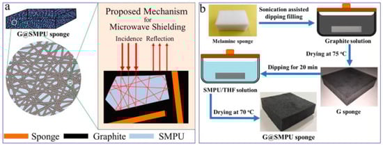 (a) Multi-reflection mechanism for microwave shielding, (b) fabrication method for shape memory graphite filled polyurethane sponge [].