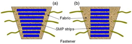 Proposed design of shape memory polyurethane/fabric bandages: (a) bandage consisting of strips with fixed strain of different length and (b) fixed length of different strains [].