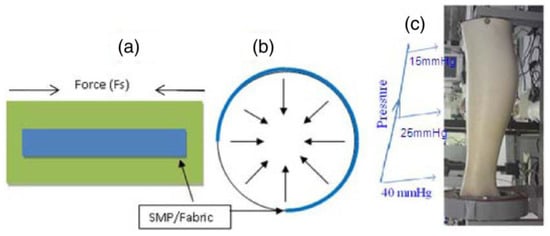 In biomedical application, the wound and venous leg ulcer treatment is indeed a significant problem []. Ulcers can be developed to persons who are affected by the reduced blood flow in leg due to diabetes, rheumatoid disease, due to aging, low physical activity, etc. []. The increased sugar level in blood and fatty substance level on the internal wall of veins can cause progressive occlusion of the vessels [,]. The healing of an ulcer can be induced by several methods whereas the application of gradual external pressure can be extremely helpful []. The skin and vascular changes can be minimized or reversed by driving fluids using external compression from the interstitial spaces into the vascular and lymphatic compartments []. It is found from the research that the external compression should be applied in gradual fashion in an upward direction with highest pressure at the ankle []. The compression can be employed by the application of pressure to govern fluid retention and suppress the swelling of the lower limb. Adequate pressure can be produced using pressure bandages due to the differences in their structure and rubber/elastic yarn content. However, several factors such as shape and circumference of the limb can affect the ability of normal pressure bandages to generate sustained compression. SMPs and their composites may serve as alternatives to produce a new class of pressure bandages. SMPs have several advantages including large strain, low cost, biocompatibility, easy processability and may thus be employed in the pressure bandage application. An inherent property of the SMP is to generate strength for recovery through the release of deformation energy upon external stimuli and the same strength can be used to generate the pressure on any circular objects. Ahmad et al. [] attempted to use the property of shape memory polymer for the pressure bandage application. They proposed two designs of bandages (Figure 3) which consisted of pre-stretched strips of temperature responsive SMPs with low transition temperature (around 50 °C) attached with fabric either with fixed strain of different length or fixed length of different strains. The developed bandage can be wrapped around the leg and the strips will shrink to their original shape upon application of external heat using a hair drier or a hot towel. The shrinkage of the SMP provides a coaxial force acting inwards (Figure 4a,b) with pre-defined pressure and its distribution for the venous leg treatment. The typical required pressure for the leg ulcer treatment at ankle is around 40 mmHg which reduces to 15 mmHg at the upper part of leg (Figure 4c).