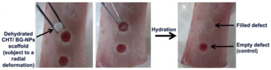 In the process of designing scaffolds and their implantation in human body, it is always beneficial to have precisely matched dimensions with the contour of bone defect. Therefore, polymers or their composites with shape memory properties can contribute significantly and scientists and researchers have developed different materials for the same application. Due to advantage of shape memory programming, polyurethane and its composites can maintain a temporary structure of interest and recover as per the need after incorporation in bone via minimal invasive bone repair []. Correia and coworkers [] developed a chitosan based scaffold which possess shape memory ability triggered by hydration. The same group [] added bioactive glass nanoparticles in chitosan by sol-gel method in order to enhance bioactivity and biomineralization ability of chitosan scaffold without affecting shape memory with a 89.9% recovery ratio. A bone like apatite layer was formed due to presence of bioactive glass when the scaffold was subjected to simulated body fluid (SBF), which suggested the suitability of the material for bone tissue engineering. The developed dehydrated composite scaffold with the temporary shape was placed in a defect of pig femur bone model which was occupied the defect contour after rehydration (Figure 5). The hydration driven shape memory permits a relatively good fixation trough a press-fitting effect.