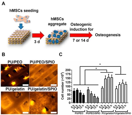 (A) Schematic of three dimensional (3D) shape memory scaffold seeding process with human mesenchymal stem cells (hMSCs), (B) fluorescent images of hMSCs in 3D scaffolds after 24 hour culture, (C) number of cells (hMSCs) cultured during 72 hour culture time [].