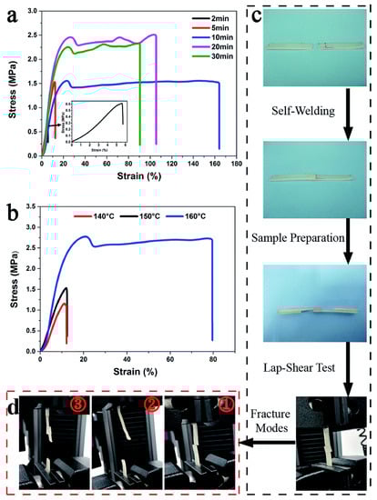 Demonstration for self-welding ability of welded polyurethane vitrimers with 3 wt% catalyst dibutyltin dilaurate (PUV-3) sample: Stress-strain curve (a) at different time at 150 °C and (b) at different temperatures for 5 min welding, (c) lap-shear test, (d) modes of fracture of different samples [].