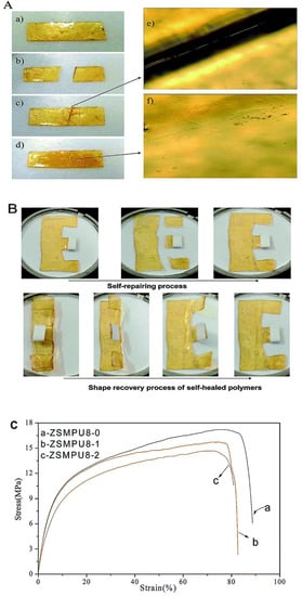 (A) Self-healing behavior of ZSMPU8 along with (B) its shape memory ability and (C) the stress-strain curve with healing cycle [].