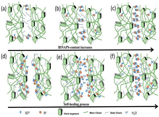 Similarly, Wen and coworkers [] reported the preparation of zwitterion polyurethane using N,N-bis (2-hydroxylethyl) isonicotinamide as soft segment and HDI as hard segment along with the incorporation of zwitterions into the backbone. Integration of zwitterions was done by way of a ring opening of PS. The developed material contained pyridine type sulfobetains responsible for the strong electrostatic interactions which also acted as physical crosslinkers. It is known that the shape memory ability was based on the phase transition and, in this case, the aggregation of zwitterions influenced the phase transition behavior of polyurethane. They also concluded that the increase in zwitterions leads to enhanced self-healing efficiency in most humid environments without any additive and external energy. It was also concluded that the hydration of the material increases ionic mobility whereas electrostatic forces improve upon dehydration. During hydration, the zwitterions may migrate to a wounded surface and hold the surfaces together via increased crosslinking upon dehydration (Figure 14).