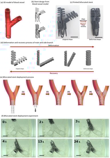 The development of implants and its design using three-dimensional (3D) printing technique can be ground-breaking. A key advantage of 3D printing technique is that one can customize the design of object based on patient requirement. Kim and Lee [] presented a novel design of bifurcated stent through the use of kirigami structures fabricated using 3D printing of SMP. The design of bifurcated stent on the basis of kirigami structure supports to produce transformable ‘Y’ shape from compactly folded initial shape and helps in smooth travel inside branched vein [,,]. The shape memory was demonstrated by fixing its shape to the compact structure via shortening at above glass transition followed by cooling. The memorized structure was regained upon heating again above the glass transition temperature. They also demonstrated the bifurcated stent (Figure 17) and found increased usefulness in case of irregular forms of blood vessels.