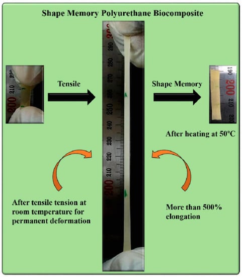 The unique capability to deform in predefined conditions and recover back to its original shape upon being triggered by different stimuli such as heat, radiation, pH, hydration, and mechanical, magnetic, and electrical influences, etc., make polyurethane a potential candidate for several applications. Polyurethanes which are versatile materials with extraordinary characteristics, inherently have two macro-phase separated domains due to the presence of a urethane bond between soft and hard segments, alternatively. However, the urethane bond is formed due to the chemical reaction between hard segment (i.e., diisocyanate) and soft segment (i.e., polymeric diol). The capability of shape memory comes from the concept of these soft and hard segments in polyurethane. The presence of hard segment provides the mechanical strength which is responsible for it to remember the initial shape after deformation whereas the energy for dissipation is stored by soft segments providing the desired force to polyurethane in order to revive it to its initial form by the action of external stimuli []. The soft and hard segments in polyurethanes govern the transitions behavior triggered by radiation, sound, heat, etc., resulting in the shape memory effect. The shape memory effect in polyurethane and its composites can be one-way, two-way, triple or quadruple based on the number of transition temperatures and soft and hard contents [,,].