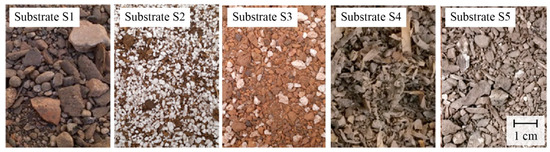 To evaluate the proposed methodology that investigates the impact of compaction on the coupled water and heat flux, empirical information from five substrates was used. The substrates used in this study are those employed by Sandoval et al. [2]. Figure 1 presents photographs of each substrate and Table 1 provides a detailed characterization of their physical properties. These five substrates were chosen because they are commonly used in green roofs (S1–S3), and because they are easily found in the local market (S4,S5). A detailed characterization of the physical, hydrodynamic, and thermal properties of these substrates, for their uncompacted state, is presented elsewhere [2]. For the compacted state, the substrate’s hydrodynamic and thermal properties were estimated using the theory presented in Section 2.2 and Section 2.3.