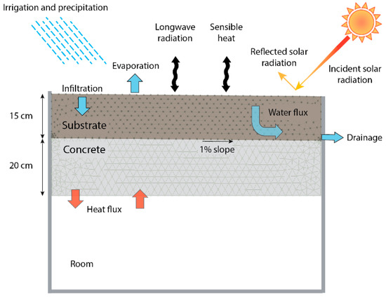 Figure 2 presents the conceptual model utilized to investigate the effect of substrate compaction on roof functioning. The system was comprised by a substrate on top of a concrete layer that was above a room. As we focused on substrate compaction, and without diminishing the relevance that vegetation has on the overall green roof functioning, the vegetation layer of this system was not included. Instead, we put our attention in analyzing the effect of compaction on green roof functioning when the five substrates investigated in this study were employed. We also put our attention into a green roof located in a semiarid zone during summer (see meteorological conditions in Appendix A), so our results were focused on the response of the hypothetical roof system subject to irrigation for a period with no precipitation, in which it is relevant to know when the green roof begins to drain (the breakthrough time). For this reason, we did not analyze water retention efficiency, peak reduction, and delay of a precipitation event.