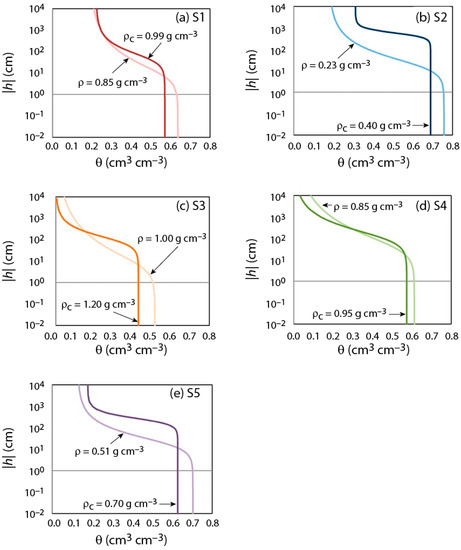 where ρs is the solid particle density of the substrate. When the porous media is compacted, Assouline [37] proposed to estimate the change in the remainder parameters of his water retention curve as follows: