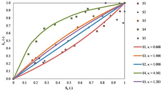 To find how the thermal conductivity changes as compaction occurs, the first step in our methodology was to determine the λe, λsol, and κ for each substrate, and the a parameter for the set of substrates. Figure 4 presents the λe as a function of the Se for each of the substrates investigated, estimated by fitting Equation (23) to the experimental thermal conductivity data to find the κ parameter for each substrate; and by fixing the a parameter to 0.1614, which yielded a good representation of the experimental values of λ0d (Equation (25)) for all the substrates. In this process, λsol was also fitted to represent correctly the thermal conductivity of each substrate and, in particular, the experimental values of λ0s and λ0d. Table 3 also presents the values of κ and λsol obtained from this fitting process.