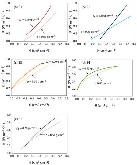 The thermal conductivity curve in absence of fluid flow for the compacted porous media, λc(θ), needs some inputs from the hydrodynamic properties: first, to determine λ0s, the θs is required, as shown in Equation (24); and second, the lower and upper bounds of the thermal conductivity curve are related to the θr and θs that also change as compaction occurs. Also, note that the impact of compaction on the λc(θ) is represented through the bulk density that is used to determine λ0d, but also through the change in the θs described in Equation (11), which modifies the λ0s.
