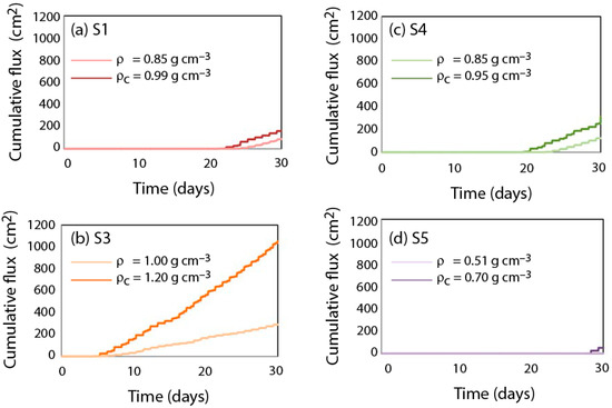 Cumulative flux that exits the bottom of the uncompacted (light lines) and compacted (dark lines) substrates during the 30 days of simulation. (a) substrate S1; (b) substrate S3; (c) substrate S4; (d) substrate S5. The results of the substrate S2 are not shown as this substrate did not drain water during the entire simulation.