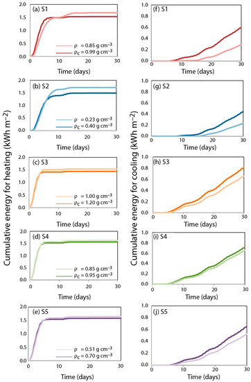 Figure 7 shows the cumulative thermal energy (heating and cooling) consumed to maintain 23 °C in the room for the entire simulation (30 days). The increment of the thermal daily amplitude, which is the result of substrate compaction, increased the heating and cooling energy due to natural convection. The biggest changes are related to substrates S1 and S2; in both cases the energy for heating was reduced and the cooling energy increased. This behavior occurs due to the mixed effects of the general increment in thermal conductivity with moisture and the high porosity that reduces the vertical diffusion.
