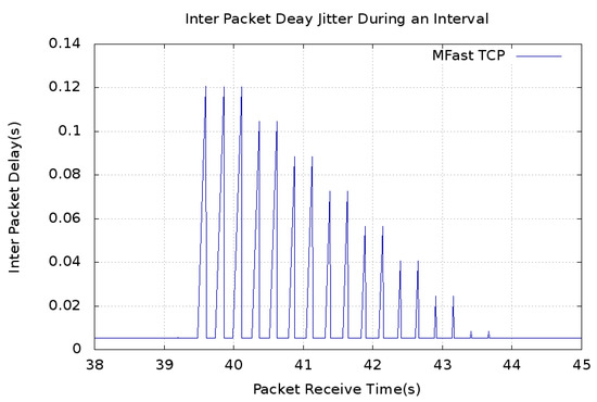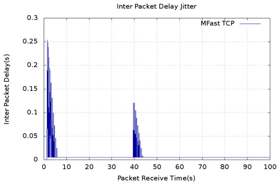 Inter-packet delay (IPD) jitter of Multistream Fast Transmission Control Protocol (MFast TCP) during the simulation period.