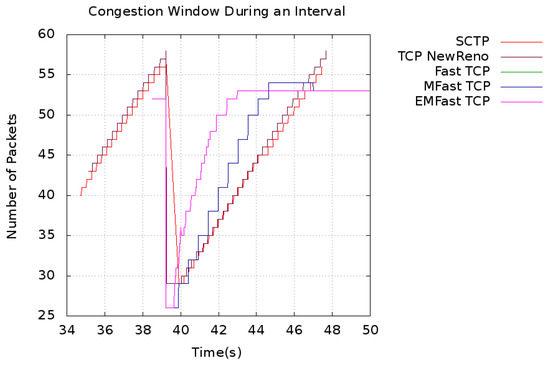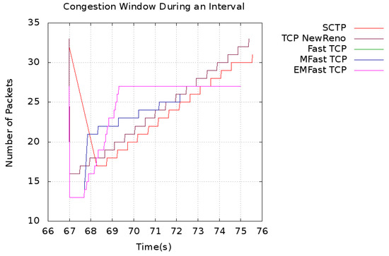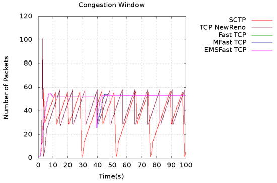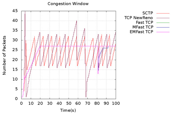 The congestion windows of SCTP and TCP New Reno fluctuate during the simulation period. This fluctuation is due to the loss-based congestion control algorithm. Fast TCP, MFast TCP, and EMFast TCP maintain their congestion windows because of the delay-based congestion control algorithm. The protocols reduce the congestion window at the time packet of loss. Fast TCP and MFast TCP showed exactly the same behavior. Therefore, the lines in the graph representing these protocols overlap each other. In the absence of competing flows, the protocols consume all available bandwidth of the network and provide maximum throughput as allowed by their algorithms.