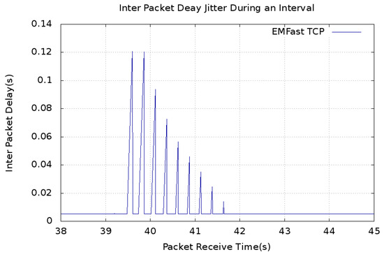 Inter-packet delay jitter during and after fast-retransmit and -recovery phases of Enhanced Multistream Fast Transmission Control Protocol (EMFast TCP).