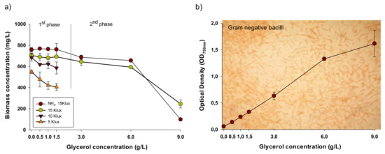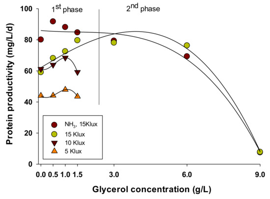 - Morais, E.G.; Druzian, J.I.; Nunes, I.L.; Morais, M.G.; Costa, J.A.V. Glycerol increases growth, protein production and alters the fatty acids profile of Spirulina (Arthrospira) sp LEB 18. Process Biochem. 2019, 76, 40–45. [Google Scholar] [CrossRef]