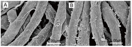 One and one-half millilitres of the mycelial suspension was placed in a 2-mL centrifuge tube; a 2% paraformaldehyde−2.5% glutaraldehyde mixed fixative pre-cooled to 4 °C was added, and the sample was fixed at 4 °C for 2 h. Subsequently, the fixative was aspirated and washed three times with 0.2 mol/L phosphate-buffered saline buffer (pH = 7.2) for 15 min. The sample was dehydrated with a 30%, 50%, 60%, 70%, 80%, 90%, 95%, and 100% ethanol solution in sequence, and the 100% ethanol solution was dehydrated twice, each time for 10–15 min. (each step required centrifugation at 4000 r/min. for 10 min.). After centrifugation, the supernatant was discarded and the precipitate was placed in a desiccator to dry overnight. The dried bacterial powder was coated with gold while using a conductive adhesive for 3 min., collected and imaged, and the untreated dry sample was used as a control.