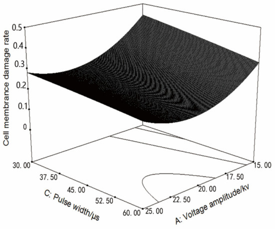 From Table 4, it can be concluded that the F value of the cell damage rate is 5.39 and the p value is 0.0186. Therefore, the relationship between the established cell damage rate and experimental factors is significant (p < 0.05), and the R2 is 0.8739, which shows that the model fitting is good and the reliability of the experimental model is high. From the data in Table 3, we can see that the influence of the quadratic term of the voltage on the cell damage rate is extremely significant, and the influence of the quadratic term of the pulse duration on the cell damage rate is not obvious.