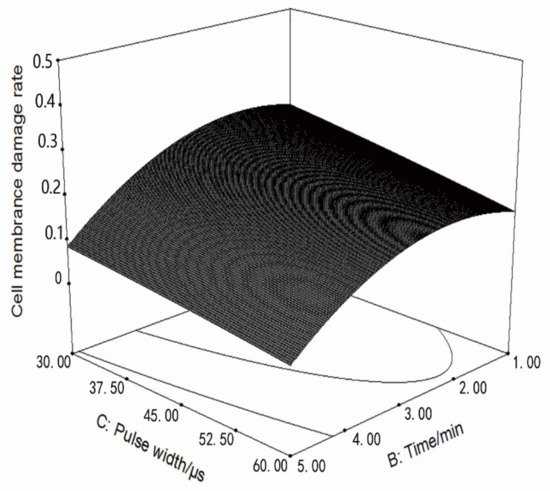As the pulse duration slowly increased, the effect was not obvious, and it can be seen from Table 4 that the change in the secondary term of processing time has a significant effect on the R. solani cell membrane damage rate (p < 0.05). When the processing time is 4.9 min., the pulse duration is 60 µs. The interaction between the voltage amplitude and pulse duration is the most obvious. At this time, the cell membrane damage rate reaches 26.35%.