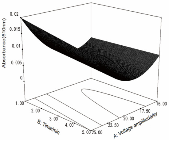It can be seen from Table 4 that the F value of the model describing the absorbance value at 510 nm is 4.05, and the p value is 0.0392, which indicates that the expression between the established absorbance value at 510 nm and the experimental control condition is significant (p < 0.05) and the R value is 0.8391, indicating that the model has good fitting and high credibility. It can be seen from the data in Table 2 that the influence of the voltage and its quadratic term on the absorbance at 510 nm is extremely significant, while the influence of the quadratic term of time on the absorbance at 510 nm is not significant.
