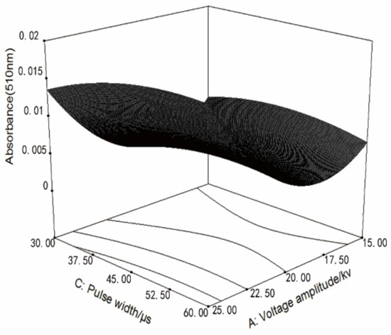 Figure 7 shows the response of the processing time and pulse duration vs. the absorbance value at 510 nm of R. solani mycelium suspension at a voltage amplitude of 20 kV. The response surface image tends to be a plane under the action of pulse duration and processing time, and the amplitude of the absorbance does not change significantly. When the voltage amplitude is at an intermediate level, the effect of different pulse durations and processing times on the suspension absorbance value at 510 nm is not significant.