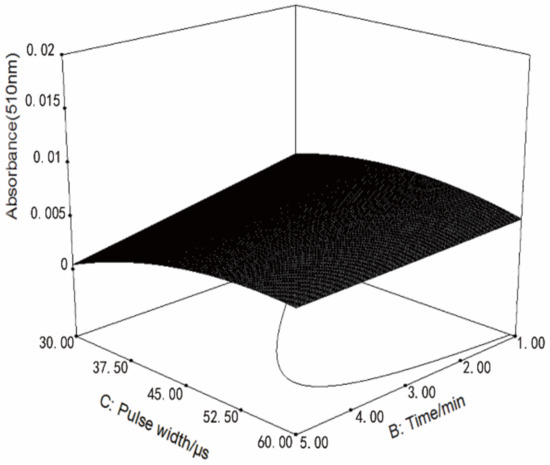The absorbance increases slightly with the processing time, while it increases slightly from 0.49% to 0.62% and then decreases with increasing pulse duration (p > 0.05). The interaction between the processing time and pulse duration is obvious when the processing time is 5 min. and the pulse duration is 42.8 μs. At this time, the cell wall damage rate reaches 0.0064.