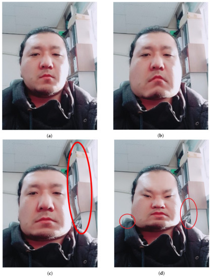 As a new form of entertainment on social media, face editing (or manipulation) in photos or videos has been demonstrated by a variety of commercial tools such as the well-known professional software, Photoshop or mobile applications such as FaceApp [1], Face Warp [2], Face Warp 2 [3], Plastic Surgery Simulator [4], and Snow [5]. However, such solutions have a number of drawbacks from both a practical and technical point of view. For instance, Photoshop provides delicate functionalities for editing photos of human faces, but it takes time and effort for users to become familiar with these capabilities. FaceApp allows users to change facial appearance more easily, but fully automated operations often lead to undesired results. Face Warp provides some useful editing functions, but only for frontal faces. With Plastic Surgery Simulator, users can freely manipulate both facial and body photos, but it is difficult to make delicate or fine changes. Face Warp 2 and Snow have the advantage of being able to easily edit both photos and live videos of human faces, but the editable parts and range are limited to a few templates. Furthermore, most such face editing applications are based on 2D image processing, and so incur background distortion. For example, manipulating the face in Figure 1a using the existing applications can result in background distortion, as shown in the red circles of Figure 1c,d. To address these performance limitations, we propose a new framework that allows 3D freeform manipulation of a face in live video. Unlike existing approaches, the proposed framework fully employs 3D geometry of a face and provides improved results with real-time performance in video frames.