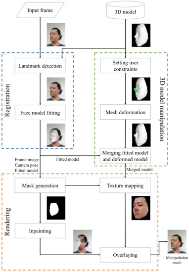 As shown in Figure 2, the proposed framework consists of three modules: registration, manipulation, and rendering. In the registration module, facial landmarks are detected from the video frame, and states of the 3D face model (position, orientation, shape, and expression) are estimated. At the same time, in the manipulation module, the mean face model in the neutral state is deformed by the user’s input, and the deformation is applied to the current state of the face model. Finally, in the rendering module, the deformed model of the current state is rendered on the video frame.