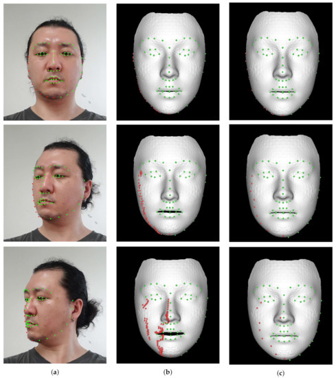 Results of facemodel fitting: (a) face landmarks detected fromthe video frame; (b) corresponding landmarks on the model searched by Huber et al. [21]; and (c) corresponding landmarks on the model searched by the proposed framework. Green dots indicate facial landmarks, and red dots highlight facial outline landmarks.