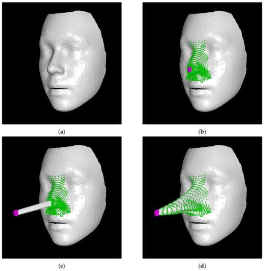 In the first step of optimization, the rotation matrices for the local surfaces are computed with the positions of ROI anchors being fixed. Then, the rotation matrices are fixed, and the positions of the moving vertices are calculated by minimizing the cost function. Figure 4 shows our results for mesh deformation by a user’s input. On the original mesh model (Figure 4a), handle anchors and ROI anchors were set by the user (Figure 4b), and the model could instantly be deformed when the positions of the handle anchors were changed by the user (Figure 4c,d).