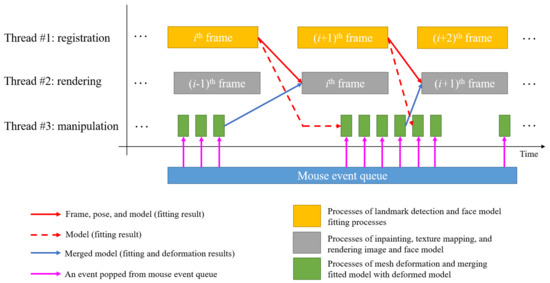 In the proposed framework, moreover, each module was assigned to separate threads for more speed-up, allowing the entire framework to operate in real time. However, it was difficult for each module to operate completely in parallel because of data sharing requirements. For instance, the manipulation module needed the results of fitting from the registration module, and the rendering module needed both the camera pose from the registration module and the deformed model from the manipulation module. To handle such dependencies more efficiently, the manipulation and rendering modules instantly used data from the previous frame rather than waiting those from the current frame. Figure 5 illustrates our inter-module parallelization scheme. While the registration and rendering modules perform their processes synchronously with the frame (orange and gray rectangles), in the manipulation module, processes run asynchronously based on a user’s input regardless of frame (green rectangles). Whenever a user picks a handle anchor with the mouse and moves the mouse pointer, the mouse events are pushed to a queue, and the processes in the manipulation module run repeatedly while emptying the queue.