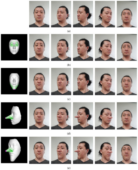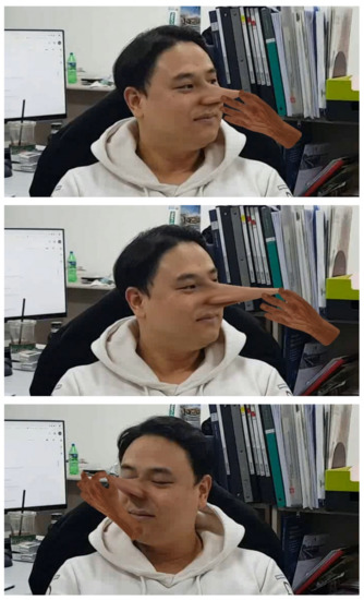 We performed experiments to demonstrate video manipulation (Figure 6) and augmented reality (Figure 7) using the proposed framework; the Supplementary Material shows these demonstrations. Figure 6 shows the results of manipulation of the original face (Figure 6a) in video frames (see the Supplementary Materials) using the proposed framework. When the face model was deformed by the user’s input (as shown in the first column of Figure 6), the shape of the face in the frame was naturally deformed without background distortion (second to sixth columns). However, some artifacts occurred at the boundary of the face (e.g., the jaw in the fourth and fifth columns of Figure 6c,e) because the background pixels were incorporated into the texture of the deformed surface as a result of registration errors. Possibly, inpainting errors could occur when the occluded regions were large due to heavy deformation. Figure 7 shows an example of augmented reality application using the proposed framework where a virtual hand picks and stretches nose of a real person.