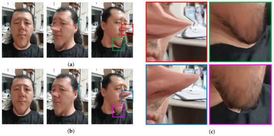 Comparison with existing application: (a) results from Plastic Surgery Simulator; (b) results from the proposed framework; and (c) magnifications of the color boxed in (a,b).