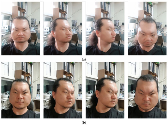 Face manipulation has been extensively studied and demonstrated on many different features such as transferring facial expressions to another face [12], replacing a face with another face [13], reshaping specific parts of a face [14,15], and facial animation for a digital avatar [16,17,18,19]. In some details relevant to our work, Kitanovski et al. [14] projected a sparse 3D face model on a 2D face image before and after deformation and computed the affine transformation using the corresponding triangles of the projected 2D meshes. This approach allowed natural and efficient manipulation without any visible distortions in real time with the help of a GPU. Since the image warping based manipulation can suffer from arbitrary rotation of head, they demonstrated it as augmented reality mirror, an appropriate application that does not require large head rotations. Similarly, Cao et al. [15] showed fine manipulation results, but the proposed method could not be applied in live video. Moreover, as deformation was achieved by adjusting the weights of predefined attributes mapped to a bilinear face model, the deformable range was highly dependent on the bases of the face model. Nagano et al. [19] implemented facial animation for a digital avatar that could be instantly generated even from a single image and rendered to reflect lighting conditions as well as expressive details (e.g., wrinkles and inside of mouth). However, deformation was confined to the range of human facial expression—in other words, it was difficult to manipulate faces into arbitrary shapes that were funny or exaggerated faces.