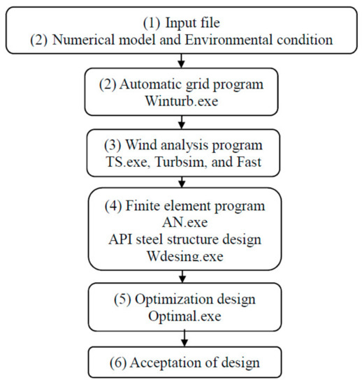 This section discusses the optimal parallel ultimate design procedures for OWT support structures. In some regions, it is necessary to consider the ultimate loads from earthquakes or tropical cyclones. For seismic loads, we proposed a finite element framework for OWT support structures subjected to seismic, wind, and wave loads, including the soil–structure interaction and a conservative soil liquefaction analysis [35]. For tropical cyclones, this study includes two procedures—one accords to the GL Tropical Cyclone Technical Note (DLCs 11.2 and 11.3) [36] or IEC 61400-3 (DLCs I.1 and I.2) [1], and the other is based on the theory of a tropical cyclone passing the OWT support structure—to obtain the time–history turbulent wind distribution. Figure 2 shows the proposed optimal parallel design procedures for OWT structures under ultimate loads. The procedures are as follows: (1) Only an input file is required to define the structural dimensions, member sizes, loads, and the parallel computer arrangement. (2) A mesh generation program, Windturb, is used to generate a structural mesh with each loading case linked to a directory in a specific computer. (3) The TS, Turbsim, and Fast programs are then performed to find the distribution of the wind load, and the time–history blade forces and moments, where TS, developed in this paper, calculates the wind loads using IEC or DNV-GL codes, and moreover, the non-stationary turbulent wind of tropical cyclones can be generated [19]. Since we assume a rigid support structure to find the blade forces, only a small proportion of the loading cases have to run in the two programs. Moreover, each analysis is executed in a CPU core independently, so this step is fully parallel. (4) After the analyses in Step 3 are finished, the structural analysis and steel design of each loading case are then performed in each directory, using a CPU core, and this step is also fully parallel. (5) An optimal program is executed to find the appropriate thickness of each member from all the structural analysis results, and the total weight of the structure is calculated. (6) If all the member sizes are acceptable, the design procedure is terminated, or the new member sizes are used and, Step 2 is initiated to perform the next design cycle. However, the Turbsim and Fast programs for Step 3 do not have to be run again, since the blade forces are the same.