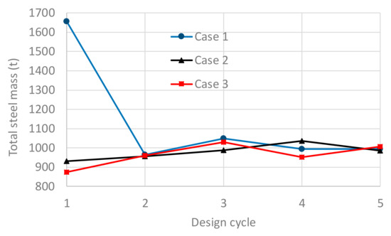 The total mass of the 5-MW OWT support structure at each design cycle, using three groups of initial member section data.