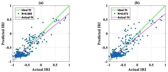 where and are inferred as output values from the models, and are the actual and mean values of IRI, respectively, and n is defined as the number of input data.