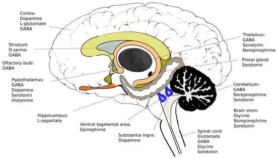The number of known neurotransmitters molecules exceeds 100 [16] and, based on their chemical structure, they are generally classified as amino acids, monoamines, neuropeptides, purines and gasotransmitters among others. Figure 1 shows the main locations of the brain where representative neurotransmitters are found in the highest concentrations.