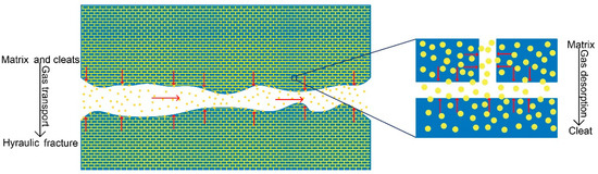 In the previous study [11], when hydraulic slotting deviation angle or the horizontal stress difference is small, the hydraulic fracture can be oriented to expand along the direction of the slotting arrangement and connect fracturing borehole to slotting borehole. Coal is typical a dual-porosity reservoirs consisting of matrix and natural fractures, termed cleats [14,15]. After directional hydraulic fracturing, fractures induced by hydraulic slotting and fracturing can provide highly permeable flow channels for gas transport into boreholes. When CMM extraction process begins, the free methane within the induced fractures will flow out firstly. Then the methane in the coal matrix will desorb into these fractures and the gas pressure will decline rapidly in the coal seam. The whole process contains a series of coupling behaviors, such as coal deformation, gas flow and heat transfer within hydraulic fractures, matrix, and cleat system. Therefore, it is crucial for gas extraction from a coal seam stimulated by directional hydraulic fracturing to consider the different type of gas flow at different scales under thermo-hydro-mechanical (THM) coupling conditions (Figure 2).