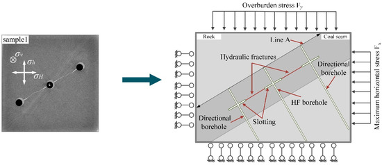 Directional hydraulic fracturing is the key technique to improve coal seam permeability along a specific direction. Previous studies [9,31,32] have shown that main hydraulic fractures can be oriented in coal seams as shown in Figure 3. The computed tomography (CT) graph from [11] in Figure 3 is used here to demonstrate the phenomenon intuitively. Based on these, a model of gas extraction from coal seam after directional hydraulic fracturing was constructed in this study. In this model, a coal seam is set between two rock layers with a dip angle is θ. Three slotting boreholes are created in the center of the coal seam. The middle slotting boreholes is a fracturing hole, and the other two slotting boreholes are directional boreholes. After hydraulic fracturing, the hydraulic fractures are presumed to directly connect the fracturing borehole and the directional boreholes, as shown in Figure 3. The maximum horizontal stress Fx is applied to the right side of the model, and the overburden stress Fx is applied to the top side. The left and base sides are roller boundaries. After directional hydraulic fracturing, the whole coal reservoir consists of the coal matrix, cleats and hydraulic fractures. The hydraulic fractures are the major routes for gas flow induced by pressure and a modified cubic law is used to calculate the flow through them. The coal matrix and cleats have important roles in CMM extraction process. A dual porosity/dual permeability model can be applied to accurately represent the interaction of coal and methane. When negative suction pressure is applied during CMM extraction, the depletion of methane changes effective stress that influences the intrinsic permeability of the coal matrix, cleats and hydraulic fractures. Meanwhile, heat transfer modulates effective stress and gas migration in coal seam. These coupled multiphysics processes are interactive and dynamic. We converted the relationships into a number of partial differential equations and solved them with Comsol Multiphysics, a finite element method solver.