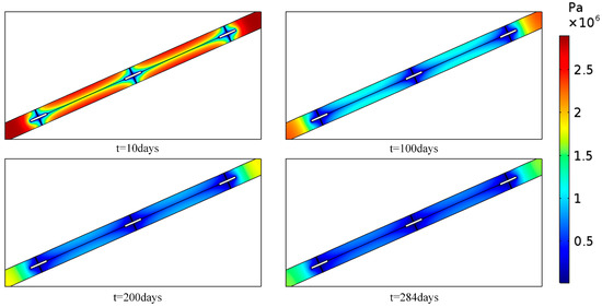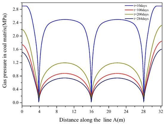 The comparison between field data and simulation results are shown in Figure 5. It can be clearly seen that the simulations results were in good agreement with the field data for gas volume. The gas pressure distribution in the matrix at different times is presented in Figure 6. Note that pressure around the slotting boreholes and hydraulic fractures declined most rapidly. The area of reduced gas pressure expanded gradually with increasing extraction time. In China, the government specifies that a gas pressure of 0.74 MPa is the criterion for the completion of extraction before mining operations are permitted [39]. The pre-mining extraction was equivalent to the outburst elimination time. As shown in Figure 7, the maximum residual gas pressure after 10 days was 2.49 MPa between the fracturing and the directional boreholes. This was far above the 0.74 MPa limit. As the extraction time prolonged, the residual gas pressure between boreholes decreased rapidly, and the pressure criterion of 0.74 MPa was reached after 284 days of extraction. The relative error of our simulation results was 5.96%, which confirmed that the current multi-scale THM model was applicable to a simulation of gas extraction from a coal seam stimulated by directional hydraulic fracturing.